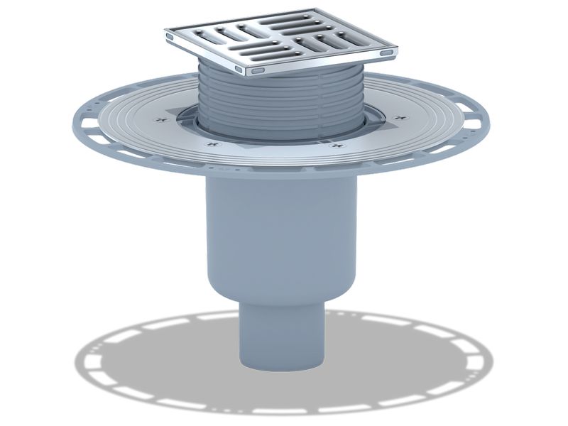 Трап вертикальный регулируемый АНИ Пласт THA5712 выпуск 50 мм с решеткой из нержавеющей стали 150х150 мм