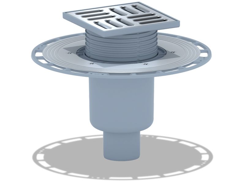 Трап вертикальный регулируемый АНИ Пласт THA5714M выпуск 50 мм с решеткой и обрешеткой из нержавеющей стали 120х120 мм