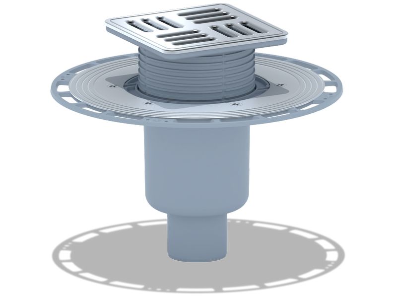 Трап вертикальный регулируемый АНИ Пласт THA5714M выпуск 50 мм с решеткой и обрешеткой из нержавеющей стали 120х120 мм