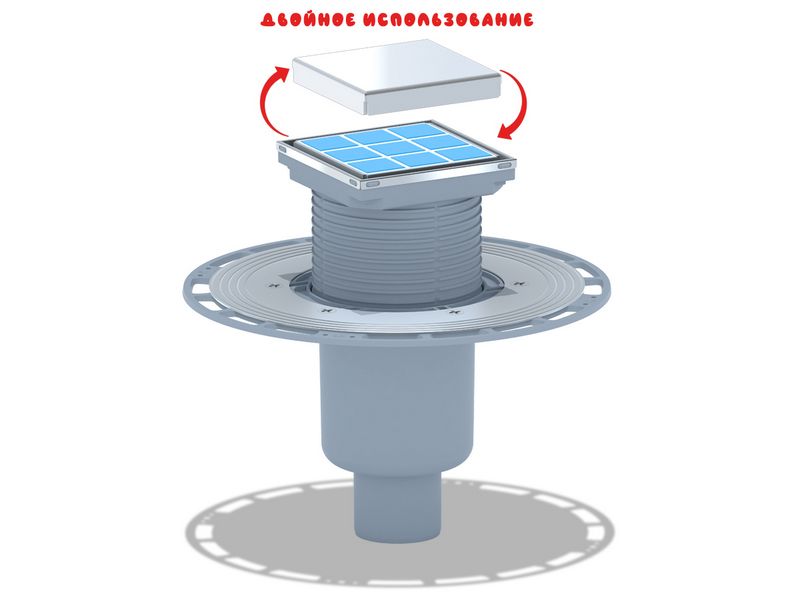 Трап вертикальный регулируемый АНИ Пласт THA5902 выпуск 50 мм с решеткой из нержавеющей стали 100х100 мм под плитку