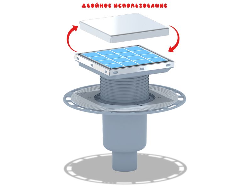 Трап вертикальный регулируемый АНИ Пласт THA5912 выпуск 50 мм с решеткой из нержавеющей стали 150х150 мм под плитку