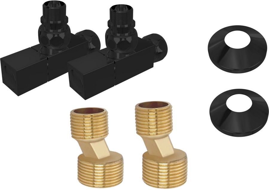 Комплект фитингов для нижнего подключения водяных полотенцесушителей типа лесенка Aquatek ( вентиль квадрат г/ш 3/4х1/2 - 2 шт + эксцентрик 3/4х1/2 - 2 шт + отражатель 3/4 - 2 шт), цвет черный муар